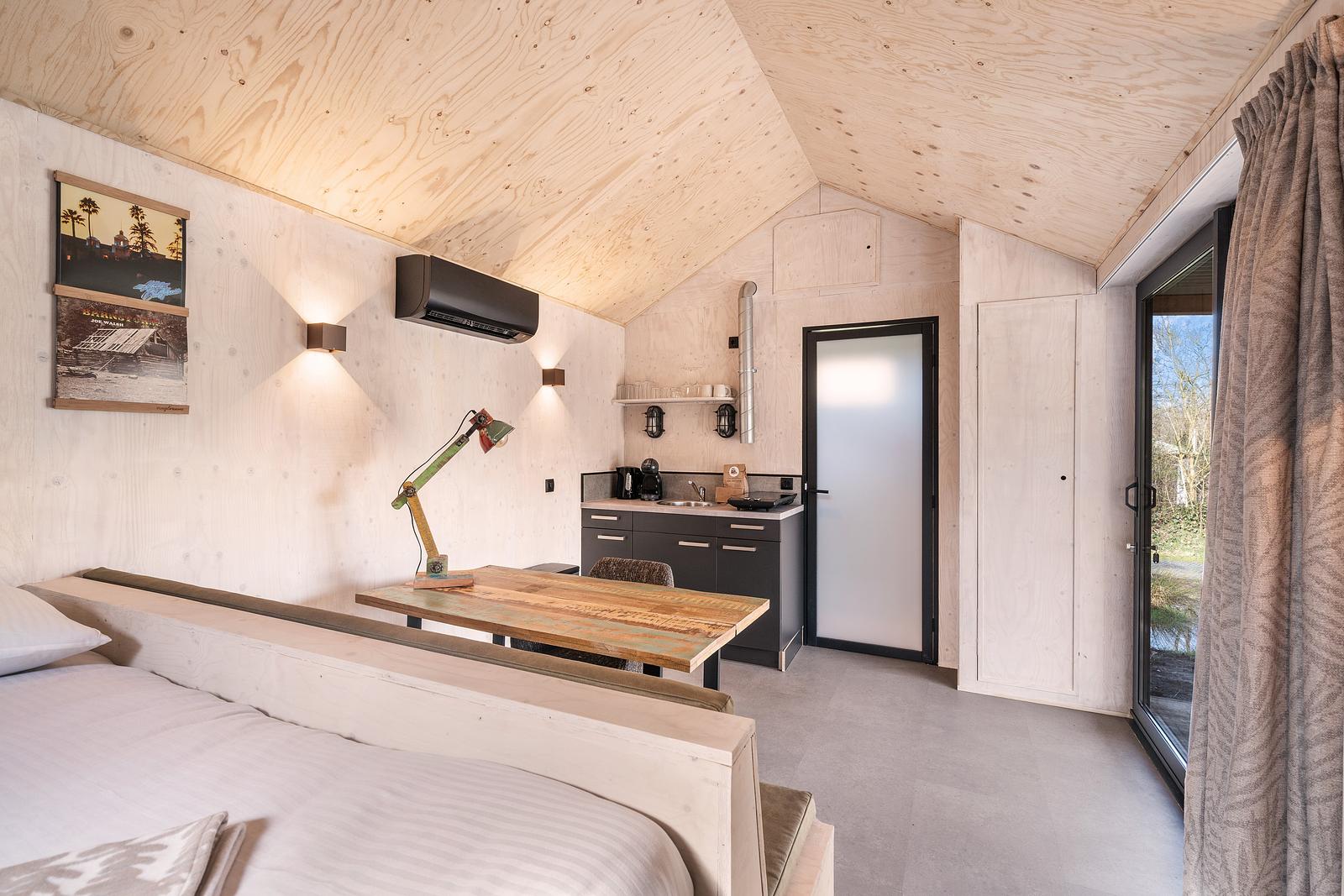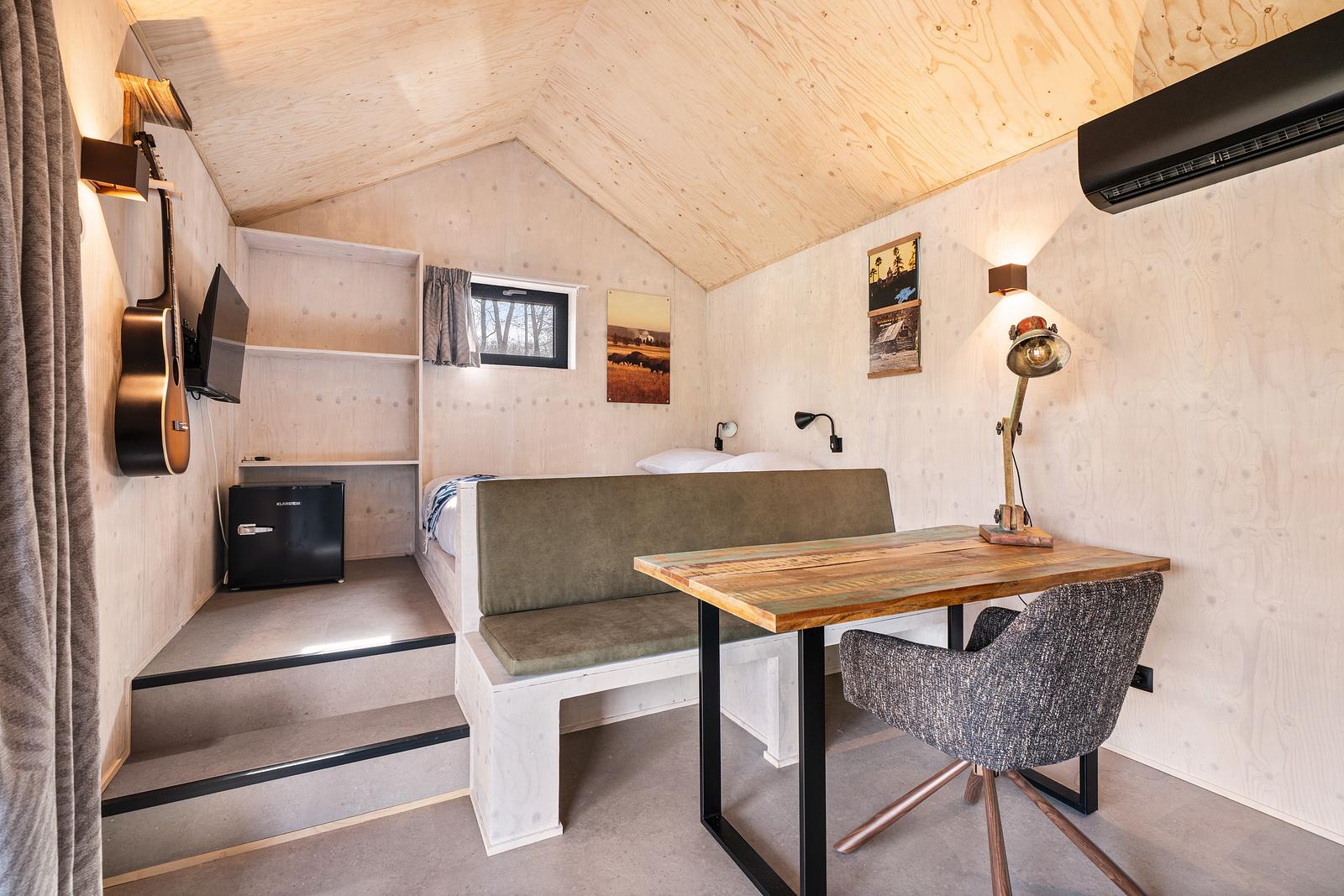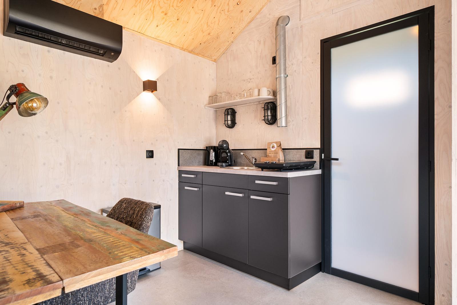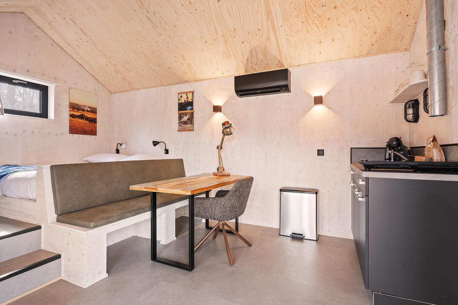 In diesen neuen Scheunen lässt es sich gut aushalten! Gemütlich, authentisch und stilvoll eingerichtet. Ein Bett mit Einzelbettdecken. Eine Sitzecke mit Sofa, in das man sich gemütlich kuscheln kann. Die Küche ist mit allen notwendigen Geräten ausgestattet. Dazu gehören ein Kochfeld, ein Kühlschrank und eine Dunstabzugshaube. In der Scheune stehen eine Dolce Gusto-Kaffeemaschine und ein Wasserkocher bereit.
